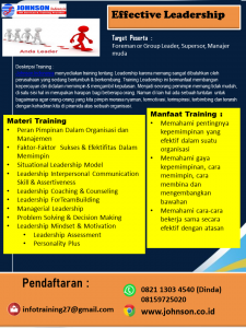 Johnson Indonesia menyediakan training tentang Leadership karena memang sangat dibutuhkan oleh perusahaan yang sedang bertumbuh & berkembang. Training Leadership ini bermanfaat membangun kepercayan diri didalam memimpin & mengambil keputusan.